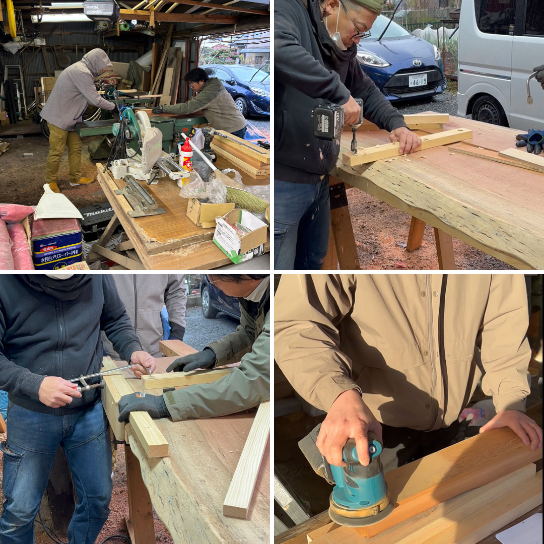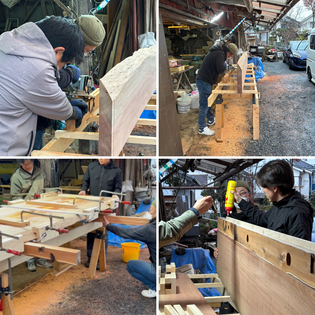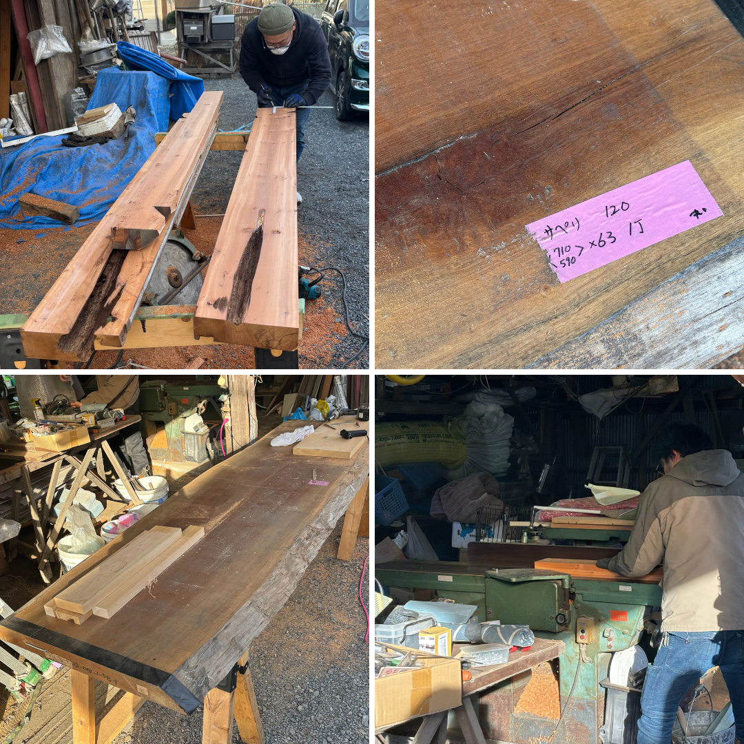 そのままでは、幅が足りなかったので、間に不要になった床柱を割いて入れ、理想のサイズに加工することに。
