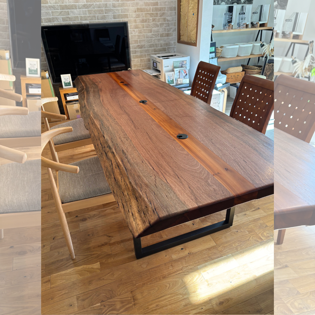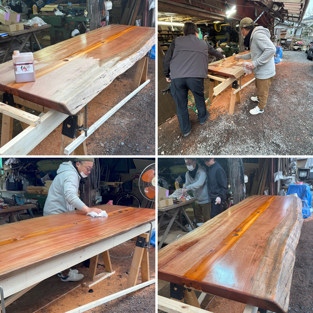 最近お気に入りの「柿渋」のクリアを塗って、更にニスも塗りました。(このテーブルでは事務作業だけでなく飲食もするので重要です。)